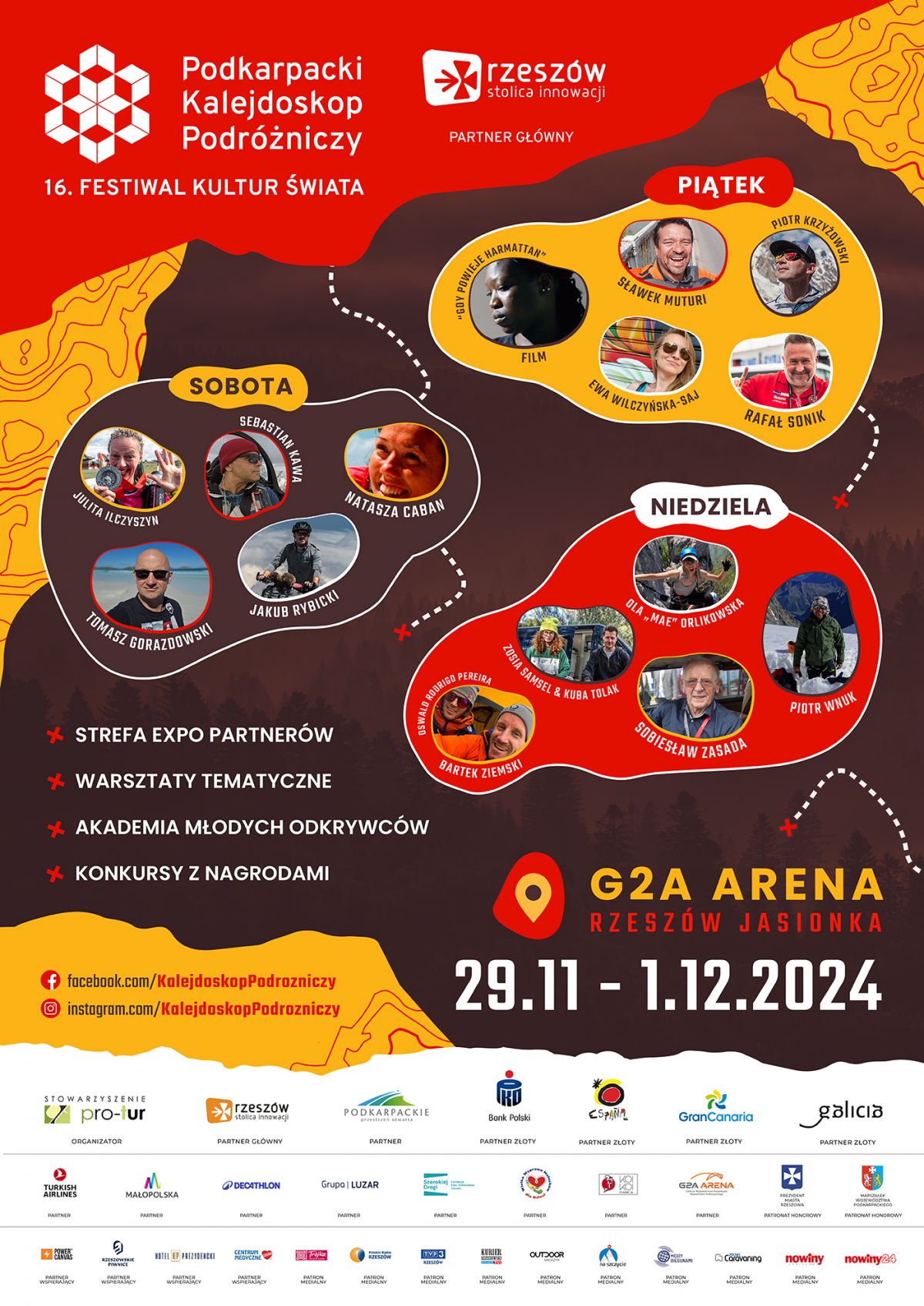 Podkarpacki Kalejdoskop Podróżniczy odbędzie się w tym roku po raz 16! To kultowy festiwal! Kalejdoskop to jedna z najstarszych i największych imprez podróżniczych w Polsce. Rzeszów na najbliższy weekend zyska miano podróżniczej stolicy, do której zawitają miłośnicy zwiedzania świata, bliższych i dalszych wypraw różnymi środkami lokomocji. A co najważniejsze do G2A Areny zjadą się oni – Ci znani, szanowani, lubiani i wyczekiwani przez publiczność goście. W piątek (29 listopada) na scenie wystąpią Sławek Muturi, Ewa Wilczyńska-Saj, Piotr Krzyżowski i Rafał Sonik. Sobota (30 listopada) ten dzień będzie należał do nich, czyli Julity Ilczyszyn, Nataszy Caban, Tomasza Gorazdowskiego i Kuby Rybickiego. Gwiazdą wieczoru będzie Sebastian Kawa, który mamy nadzieje pokaże publiczności, że „sky is no limit”! Za to w niedzielę (1 grudnia) wystąpi siedmioro wspaniałych: Ola „Mae” Orlikowska, Zosia Samsel & Kuba Tolak, Sobiesław Zasada i Piotr Wnuk. Kropkę na i na najwyższym poziomie postawią Oswald Rodrigo Pereira i Bartek Ziemski.
