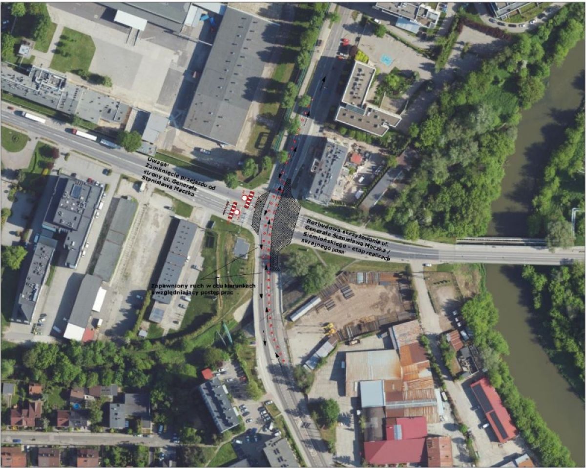 Funkcjonująca obecnie na tym skrzyżowaniu sygnalizacja w poniedziałek zostanie wyłączona. Ruch przez dotychczasowe skrzyżowanie będzie odbywał się wyłącznie wzdłuż ul. Siemieńskiego. Nie będzie możliwy wjazd oraz wyjazd ze skrzyżowania od strony ul. Gen. Maczka.