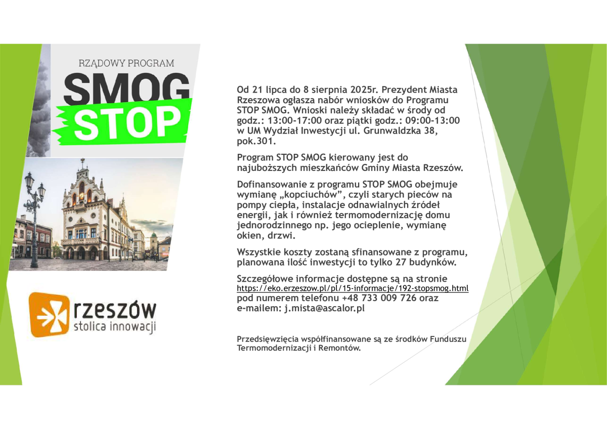 Szczegółowe informacje na temat programu STOP SMOG znajdują się na stronie https://eko.erzeszow.pl/pl/15- informacje/192-stopsmog.html, pod numerem telefonu +48 733 009 726 (pon.-pt. 7.30-15.30) oraz e-mailem: j.mista@ascalor.pl