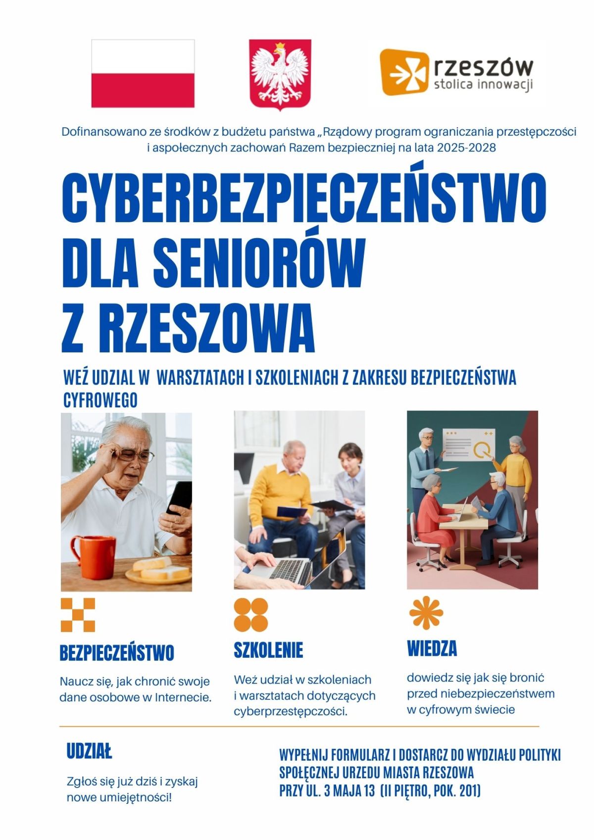 Prezydent Miasta Rzeszowa zaprasza osoby w wieku 60+ zamieszkujące w Rzeszowie do udziału w nowym projekcie ukierunkowanym na podnoszenie wiedzy i umiejętności związanych z bezpiecznym korzystaniem z internetu i nowych technologii. Projekt realizowany jest w ramach Rządowego programu ograniczania przestępczości i aspołecznych zachowań „Razem bezpieczniej” na lata 2025–2028.