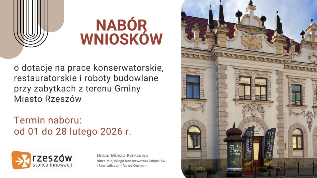 Prezydent Miasta Rzeszowa ogłasza nabór wniosków na dotacje celowe z budżetu Miasta Rzeszowa na prace konserwatorskie, restauratorskie lub roboty budowlane przy zabytkach wpisanych do rejestru zabytków, położonych w obszarze Gminy Miasta Rzeszów, niestanowiących jej wyłącznej własności w roku 2026.