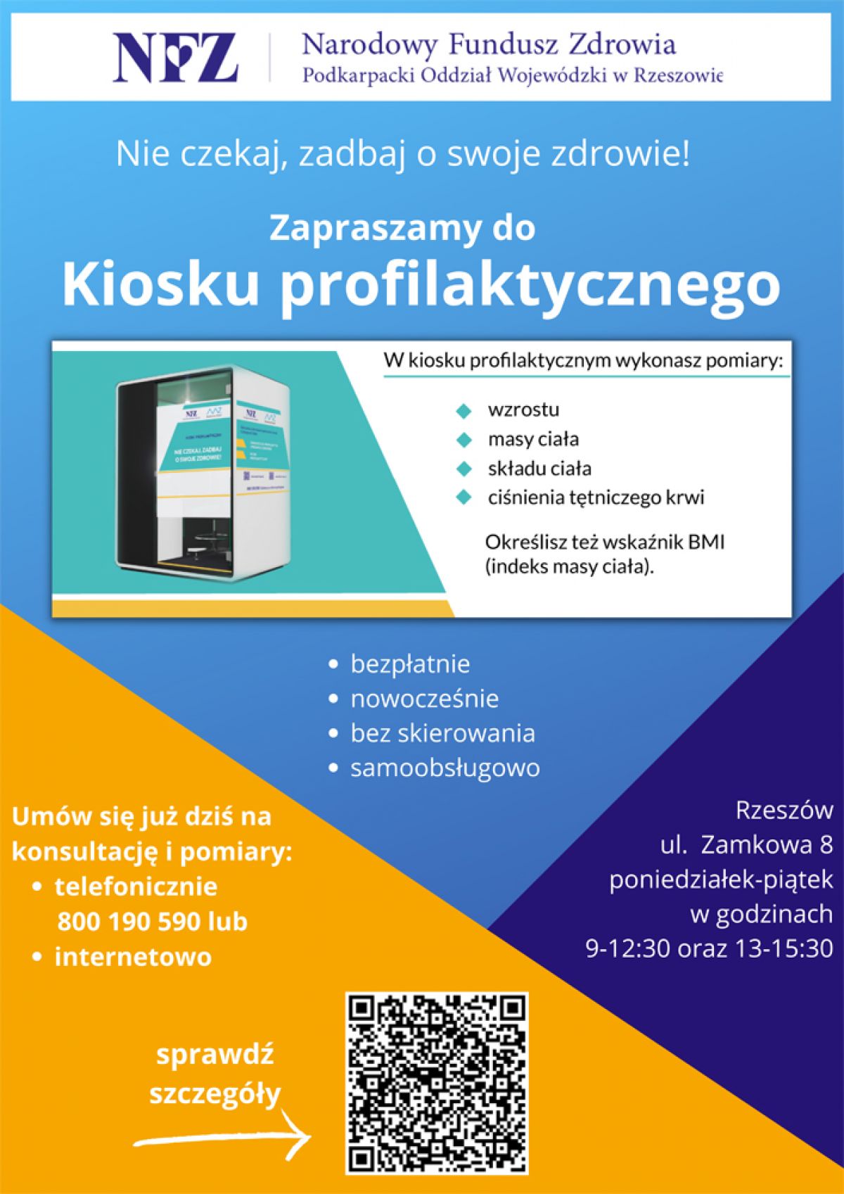 Aby skorzystać z usług doradcy ds. profilaktyki i promocji zdrowia oraz z pomiarów w kiosku profilaktycznym, wystarczy zapisać się przez stronę internetową Podkarpackiego Oddziału Wojewódzkiego NFZ lub przez Telefoniczną Informację Pacjenta – dzwoniąc pod bezpłatny i całodobowy numer 800 190 590.