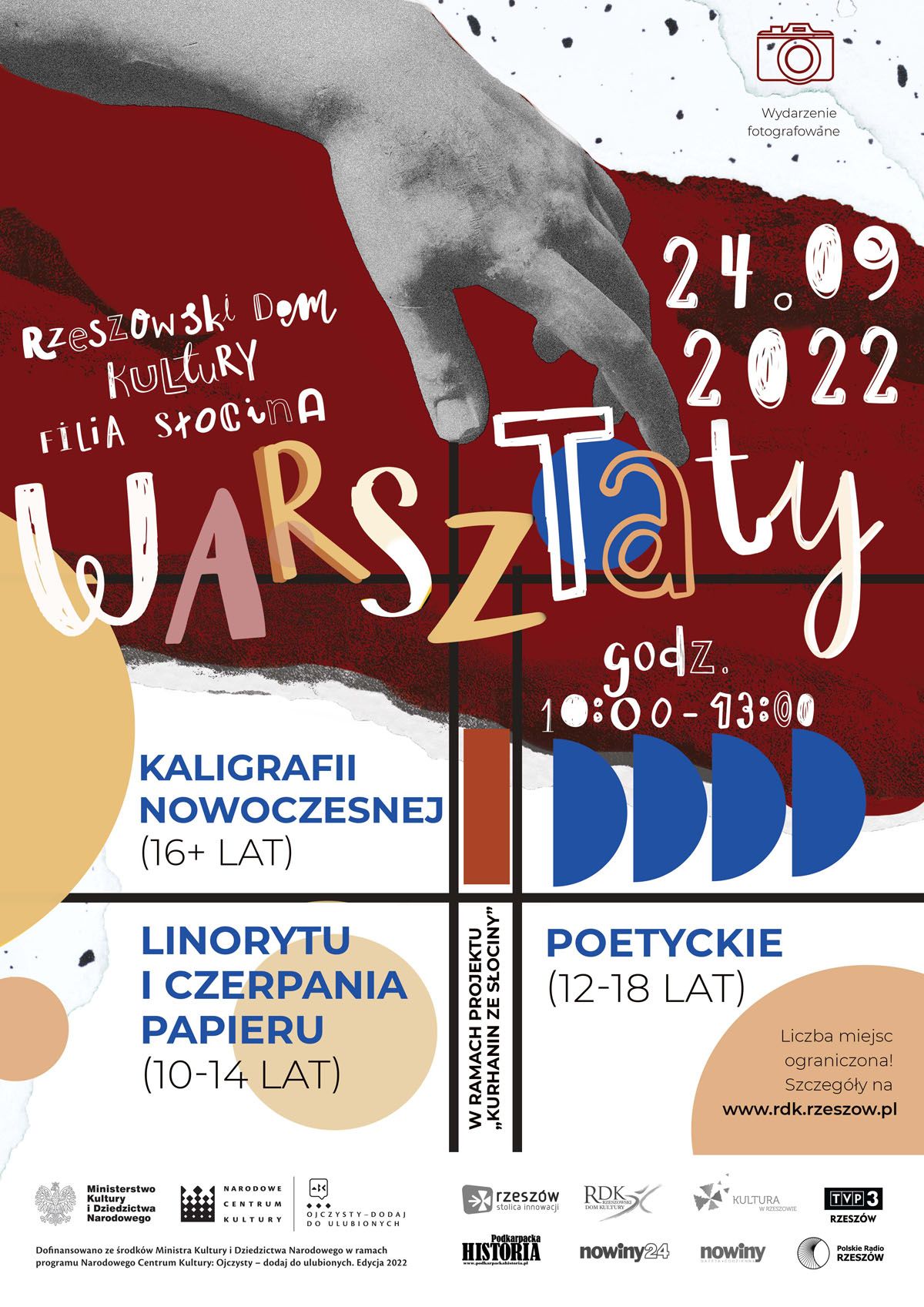 Pierwszą część projektu stanowić będą warsztaty, podczas których uczestnicy wraz z prowadzącymi skupią się na słowie i jego prezentacji, czyli aspektach niezwykle ważnych dla Stanisława Gliwy w jego pracy zawodowej. Trzy odrębne bloki tematyczne dla różnych grup wiekowych zostaną zaprezentowane w ramach warsztatów: poetyckich (12-18 lat), kaligrafii nowoczesnej (16+ lat) oraz linorytu i czerpania papieru (10-14 lat). Odbędą się one jednocześnie w sobotę 24 września 2022 roku w godzinach 10:00-13:00 w Rzeszowskim Domu Kultury filia Słocina.
