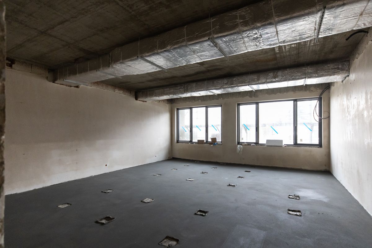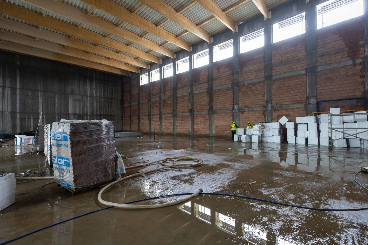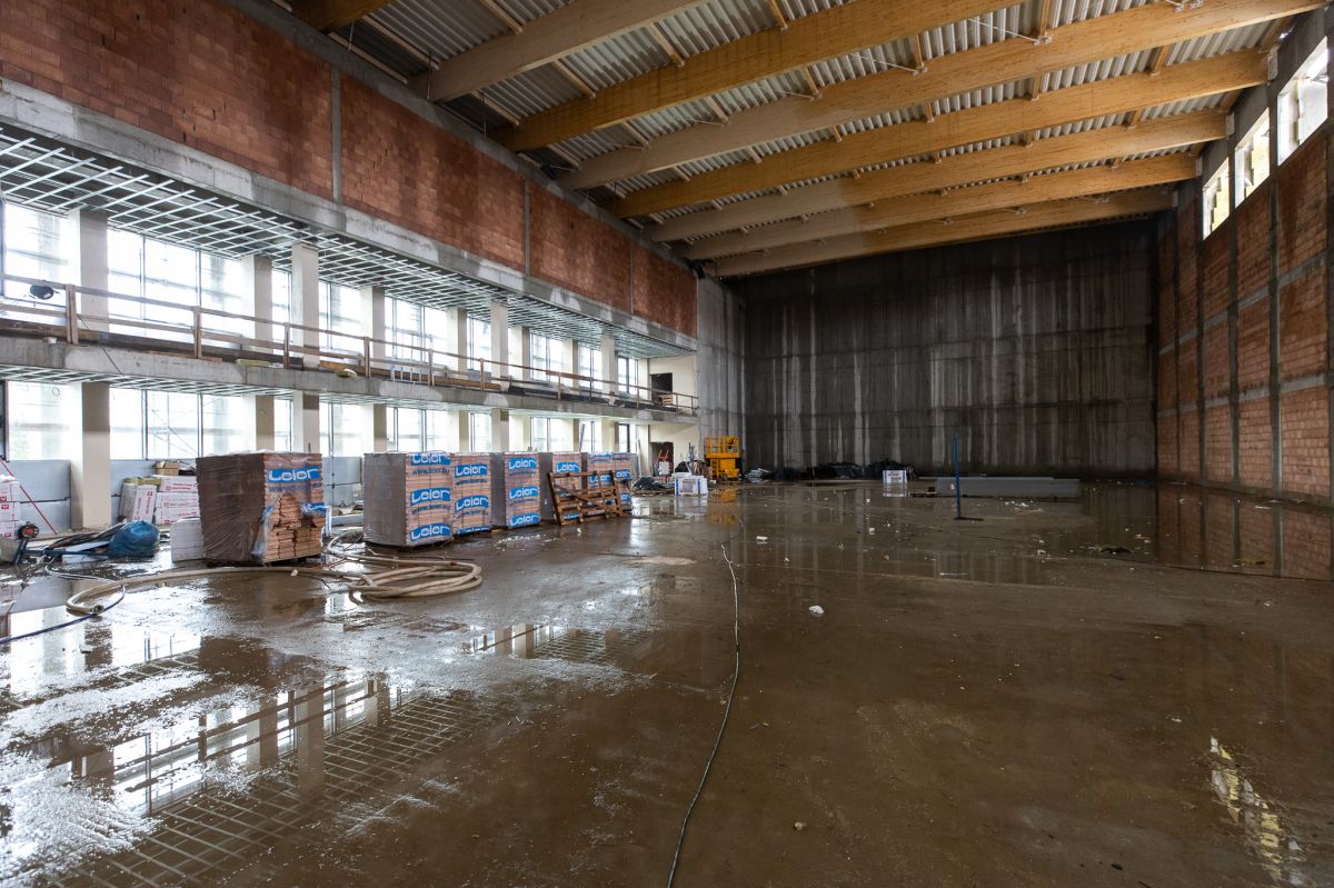Jednocześnie w budynku montowana jest stolarka okienna oraz elementy zewnętrznej elewacji. Na poziomie zero, który mieści się pod główną halą montowane są instalacje wewnętrzne. W tym miejscu powstanie m.in. siłownia i sale komputerowe.