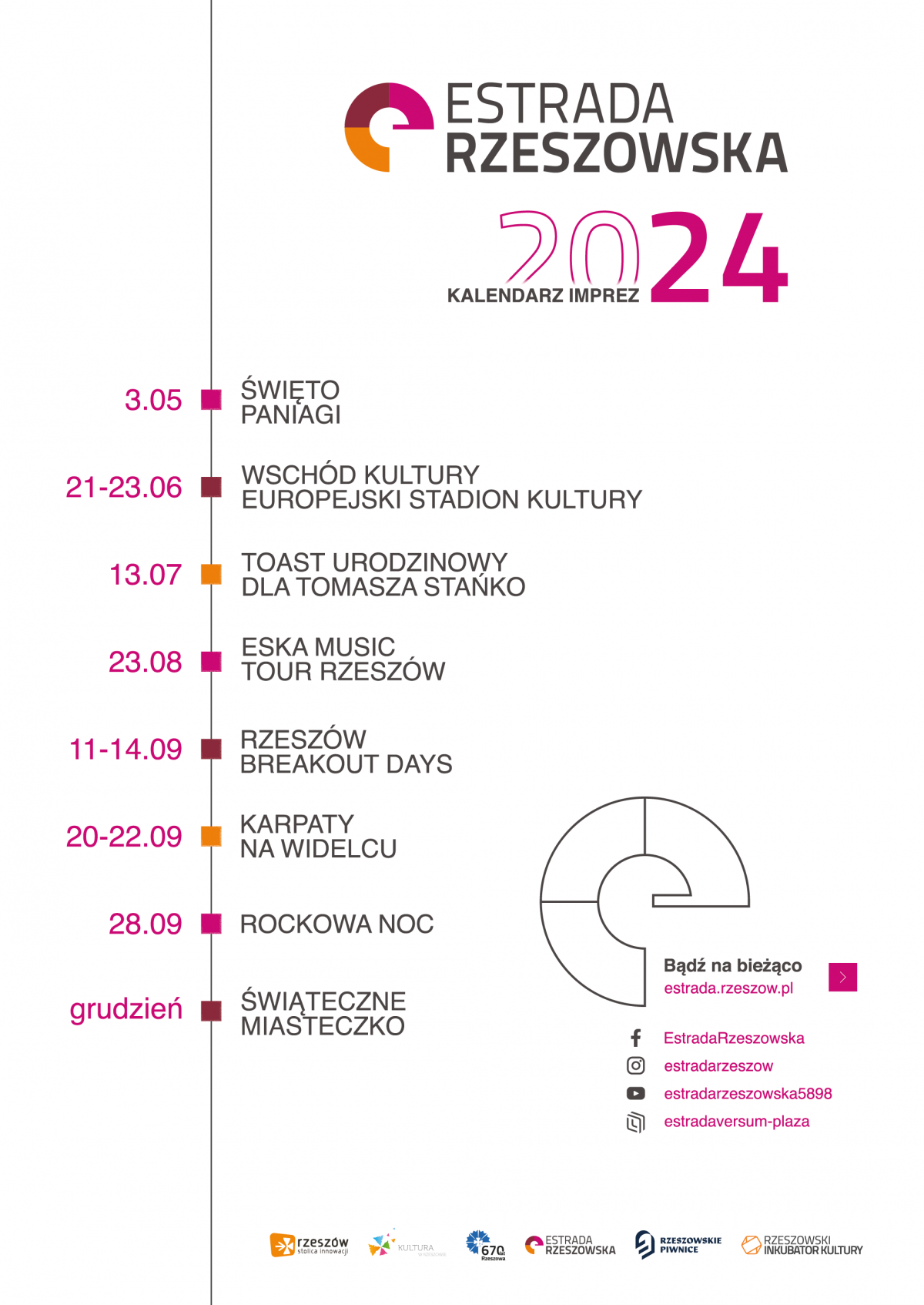 Estrada Rzeszowska ogłasza kalendarz wydarzeń na rok 2024, który obfituje w różnorodne i inspirujące imprezy kulturalne- od festiwali muzycznych po święta lokalne. Oferta jest skierowana do odbiorców z każdej grupy wiekowej, zarówno do mieszkańców Rzeszowa jak i miłośników kultury z całej Polski.