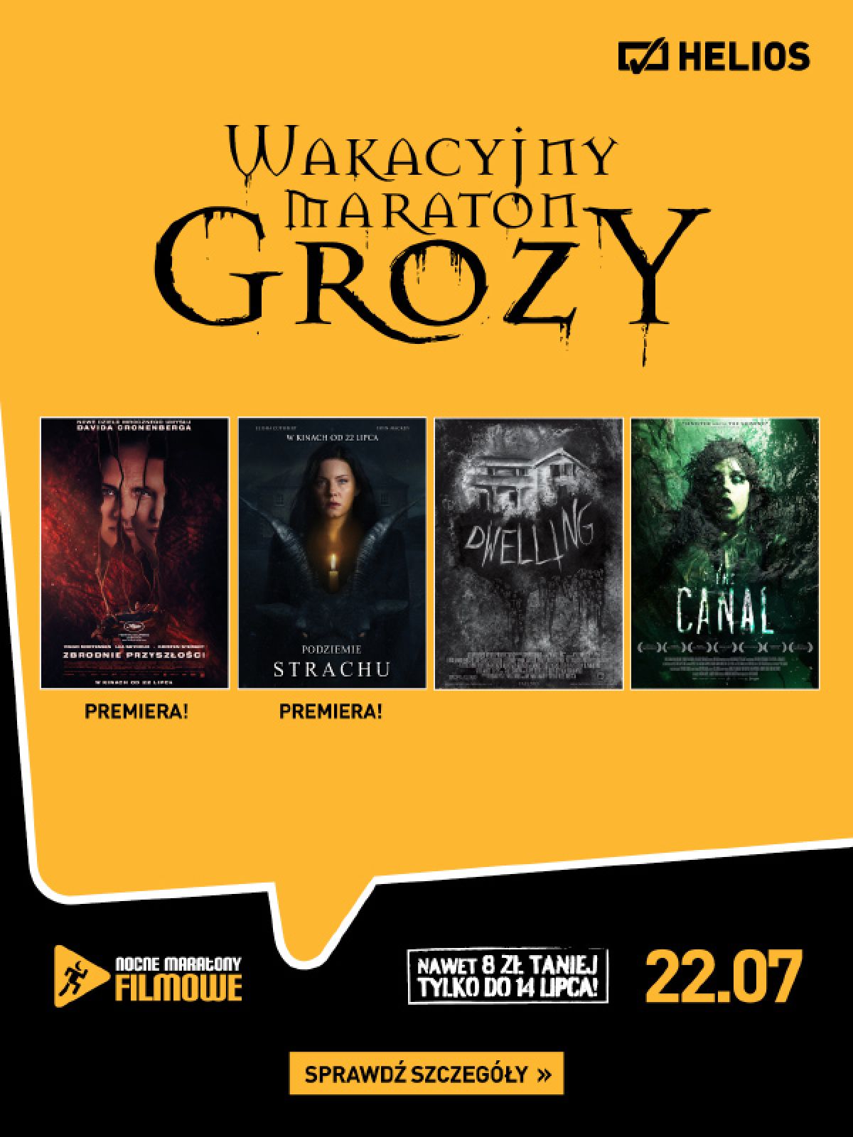 22 lipca, środek wakacji, pełnia lata, błogi sielankowy nastrój, idealne warunki na przeżycie nocy pełnej… OBEZWŁADNIAJĄCEJ GROZY!!! W ciągu jednej nocy pokażemy cztery horrory, po których jeszcze długo będziecie chcieli zasypiać przy włączonym świetle. Na początek najnowszy film Davida Cronenberga „ZBRODNIE PRZYSZŁOŚCI” z Viggo Mortensenem i Kristen Stewart w rolach głównych. Drugą premierą tej nocy będzie wciągające w mroczną otchłań „PODZIEMIE STRACHU”! Po chwili przerwy poczucie grozy będzie tylko narastać w „DWELLING”, by osiągnąć szczyt nad ranem, w „THE CANAL”. Czy jesteście na to gotowi?