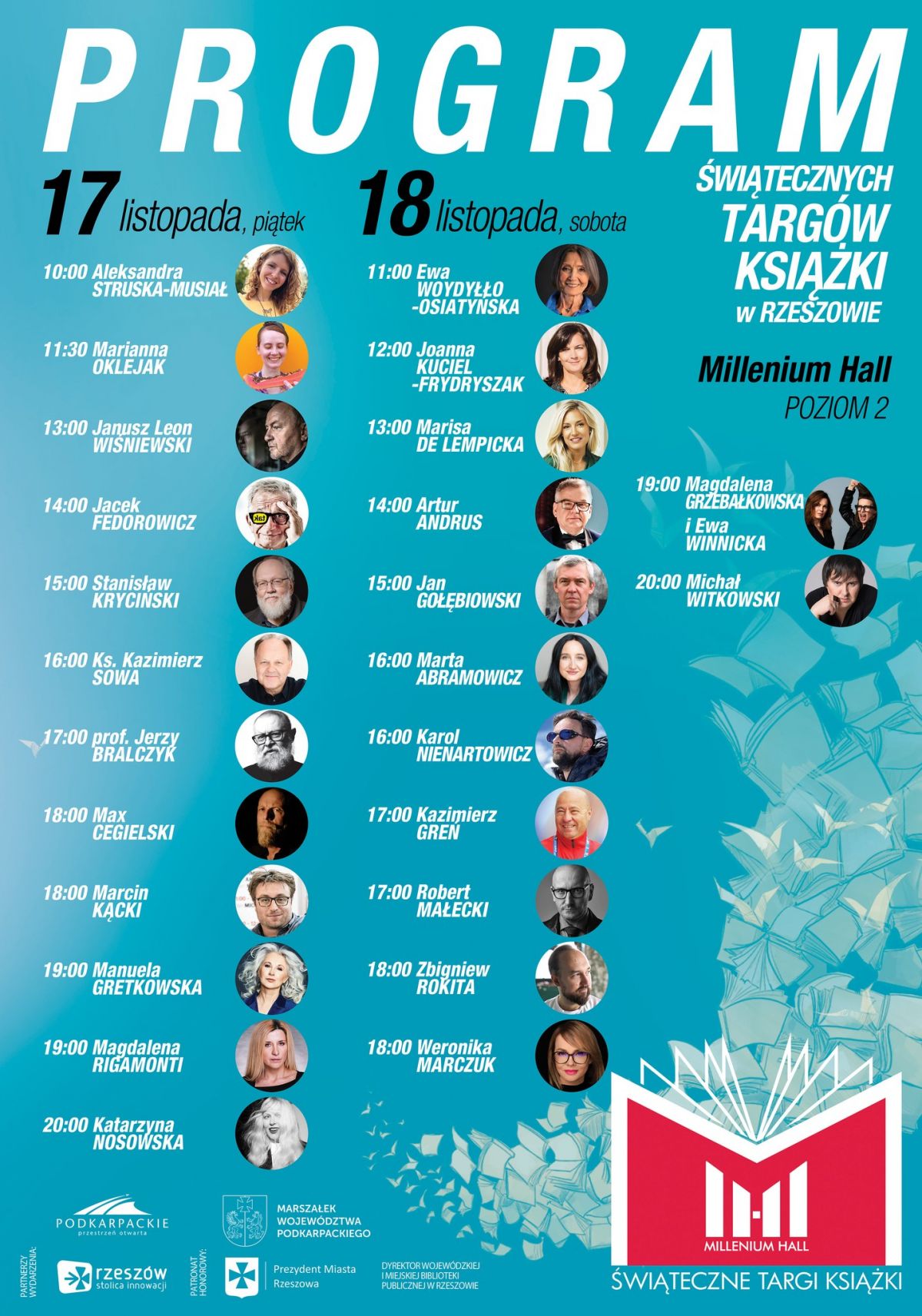 Świąteczne Targi Książki w Centrum Kulturalno-Handlowym Millenium Hall w Rzeszowie, to prawdziwe święto literatury. W dniach od 17 do 18 listopada 2023 roku, po raz 5 do stolicy województwa podkarpackiego przyjadą ważne i ciekawe wydawnictwa, które przygotują premiery i oferty książkowe. Czytelnicy będą mogli wziąć udział w spotkaniach autorskich i zdobyć autograf. Odbędą się również 2 wystawy – reprodukcji obrazów Tamary Łempickiej oraz Cerkwie i ikony Łemkowszczyzny.