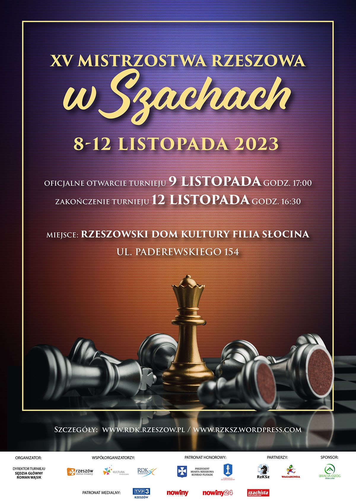 W dniach 8 – 12 listopada 2023 roku w Rzeszowskim Domu Kultury filia Słocina rozegrane zostaną XV Mistrzostwa Rzeszowa w Szachach, których organizatorem jest Dyrektor i Sędzia Główny Turnieju – Roman Wąsik. W zawodach mogą wziąć udział wszyscy pasjonaci królewskiej gry bez względu na wiek, a na zwycięzców czekają nagrody finansowe oraz rzeczowe.