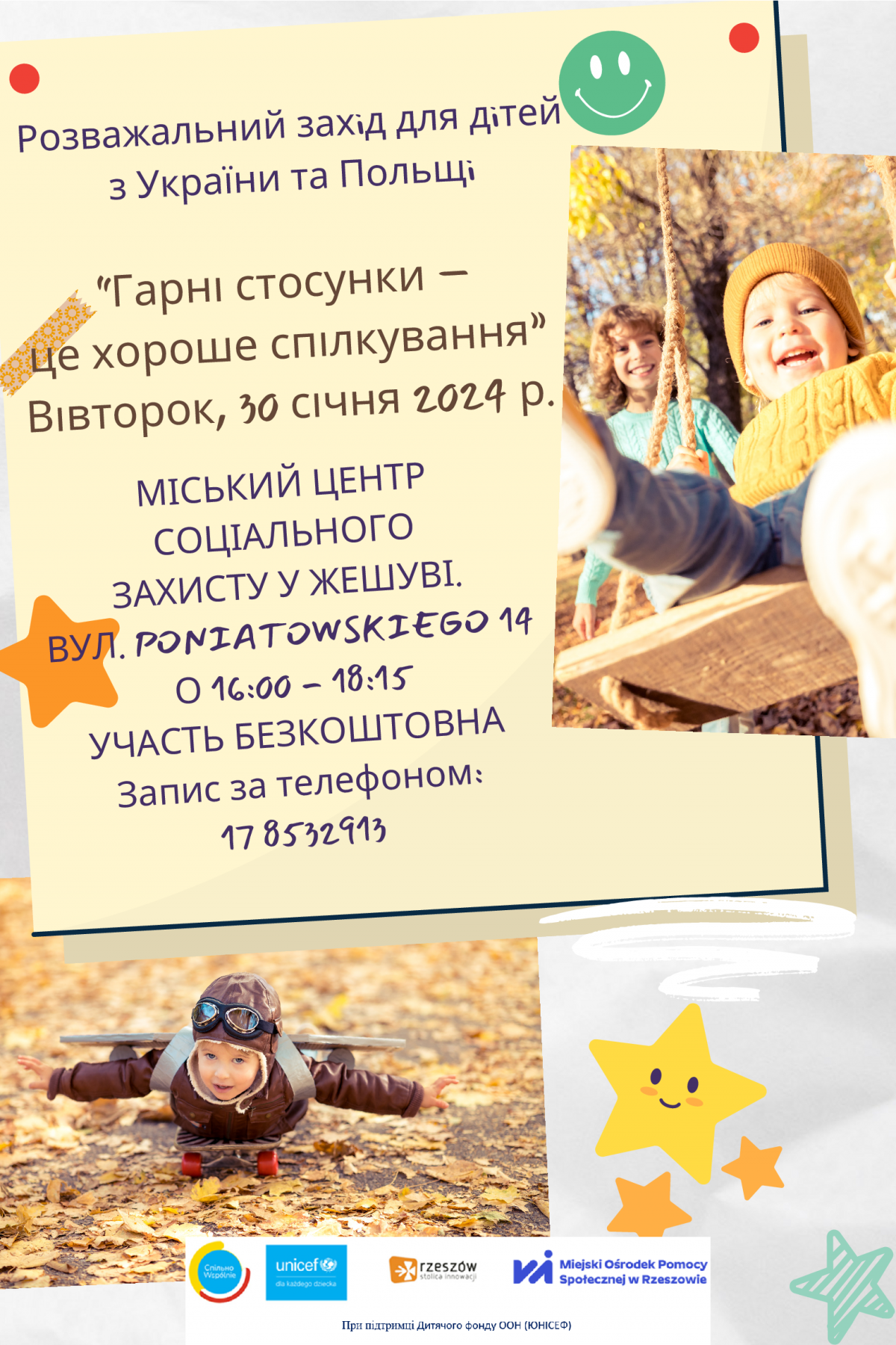 Miejski Ośrodek Pomocy Społecznej w Rzeszowie serdecznie zaprasza do udziału warsztacie z zakresu rozwoju kompetencji społecznych dla dzieci z Ukrainy i Polski 30 stycznia 2024 r, o godz 16:00. Warsztat to kontynuacja działań w ramach współpracy z UNICEF. Celem warsztatu jest integracja dzieci z Ukrainy i Polski, wzajemne poznanie się, zbudowanie pozytywnych relacji, a przede wszystkim rozwój kompetencji społecznych