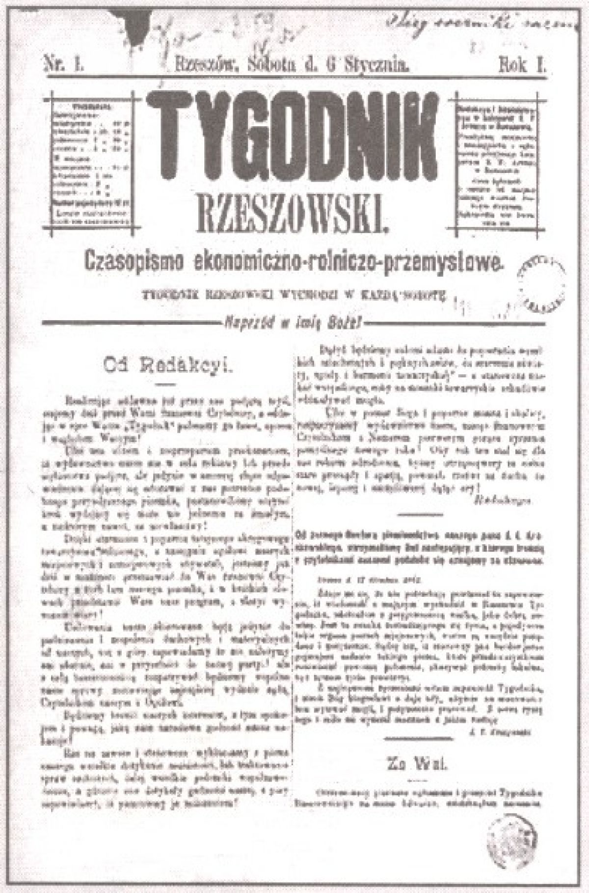 - Zdaje mi się, że nie muszę powtarzać zapewnienia, że wiadomość o mającem wychodzić w Rzeszowie Tygodniku odebrałem z przyjemnością wielką, jako dobrą nowinę. Jest to oznaka rozbudowującego się życia, a pojedyncze takie organa potrzeb miejscowych, wielce są wszędzie pożądane i potrzebne. Sądzę też iż Szanowny Pan bardzo jasno pojmujesz zadania takiego pisma, które przede wszystkim powinno rozświecać położenie, ukazywać potrzeby lokalne, być tętnem życia prowincji. Z najlepszymi życzeniami witam zapowiedź Tygodnika i niech Bóg błogosławi i daje siły abyście na stanowisku tem wytrwać mogli i pożytecznie pracować. Z serca życzę tego i miło mi wyrazić szacunek z jakim zostaję.