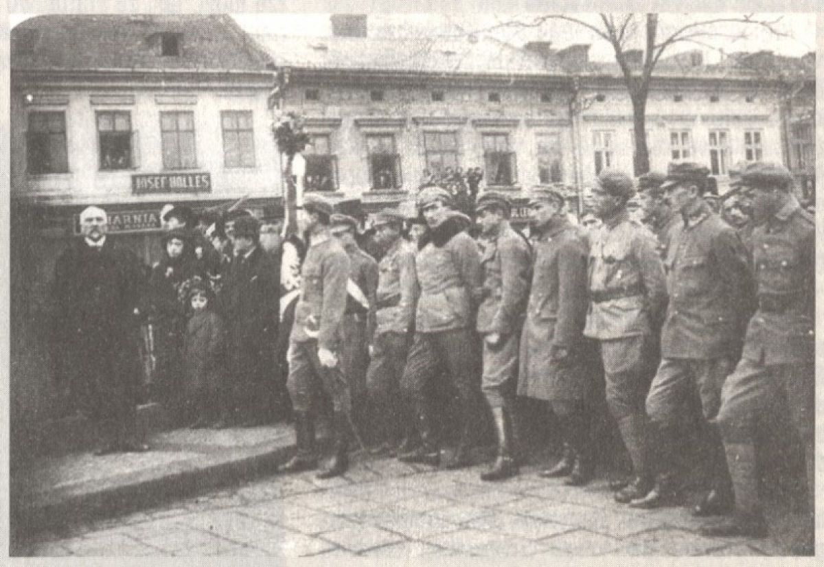 Dr Jabłoński i Dr Nieć udają się do pułk. Brücknera i mając za sobą oświadczenie oficerów, żądają od niego poddania się rozkazom OON. Po stanowczej naszej rozmowie płk Brückner zdziera z czapki orzełka austriackiego i oddaje się do dyspozycji, przytem jednak oświadcza, że z całego wojska nie zostało ponad dwudziestu kilku żołnierzy. Po powrocie od płk. Brücknera zapada decyzja utworzenia straży obywatelskiej i przeznacza się do tego por. Kotowicza, por. Münnicha, inż. Żurowskiego i prof. Kosińśkiego. Zaraz na Wydziale, który wówczas liczył 70 członków a nadto z oczekującego na wyniki obrad OON obywatelstwa rekrutują się członkowie Straży. Asenterunek trwa na drugi dzień, walnie wspomaga swymi wpływami wśród robotników pan Waller. P.O.W. idzie z nami ręka w rękę. Kolejarze tworzą swoją straż osobną w porozumieniu z nami - młodzież szkół średnich garnie się tłumnie.