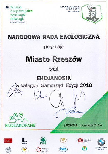 Wręczono nagrody w Krajowym Konkursie Ekologicznym EKO JANOSIK. Laureatem Krajowej Nagrody Ekologicznej EKOJANOSIK - ZIELONA WSTĘGA POLSKI zostało Miasto Rzeszów, spółka Miejskie Przedsiębiorstwo Komunikacyjne Sp. z o.o. w Rzeszowie oraz inna rzeszowska spółka miejska - Miejskie Przedsiębiorstwo Energetyki Cieplnej.
