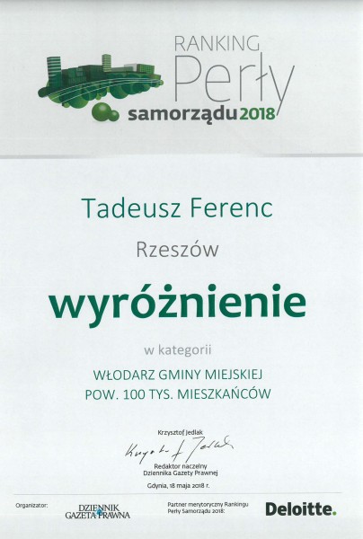 Ogólnopolska Federacja Przedsiębiorców i Pracodawców - Przedsiębiorcy.pl uhonorowała Prezydenta Rzeszowa Tadeusza Ferenca tytułem i statuetką Najlepszy Prezydent Miasta 2018 oraz Miasto Rzeszów tytułem Gmina Roku 2018.