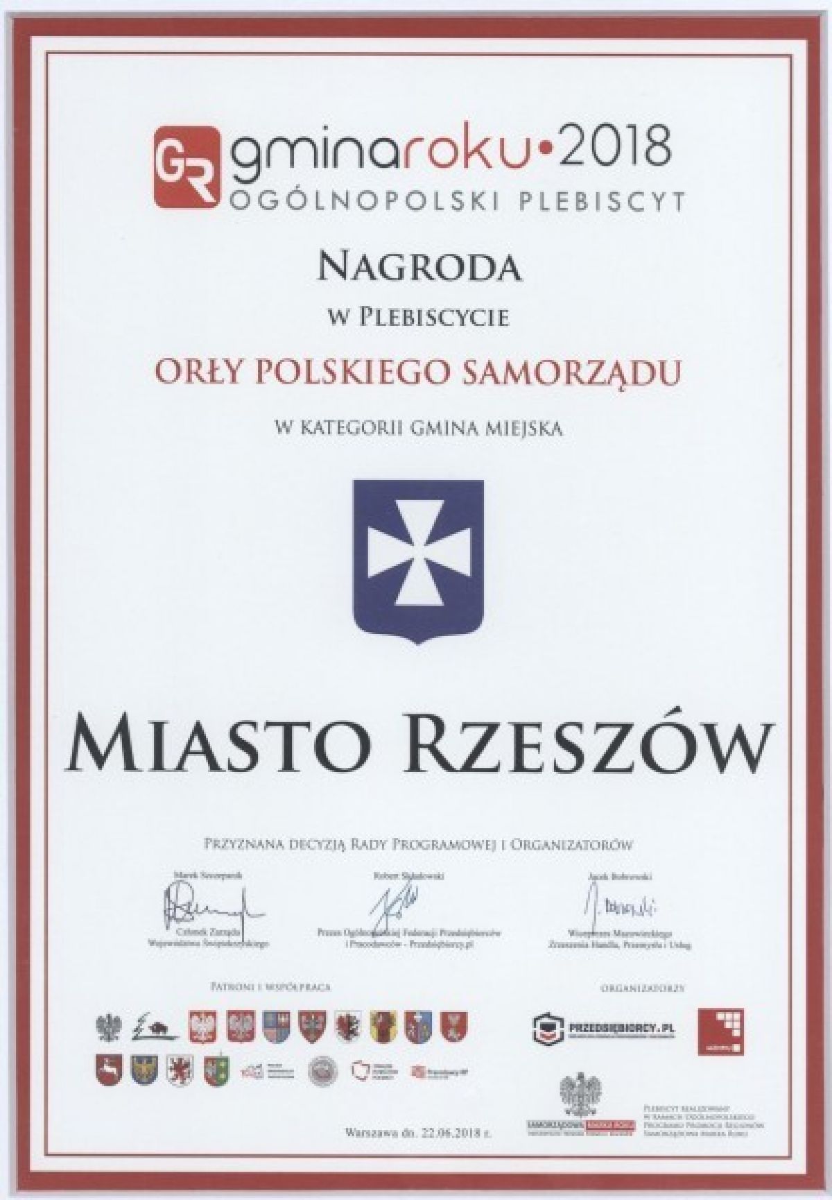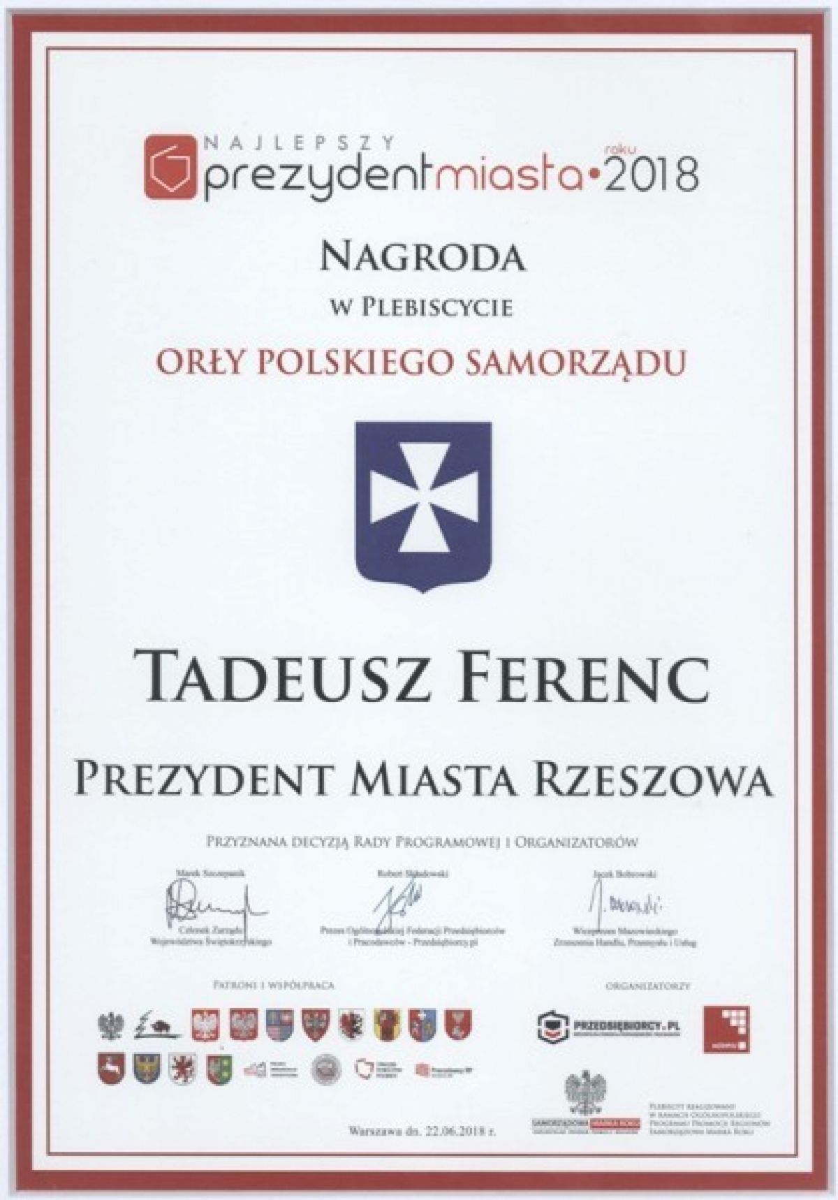 Ogólnopolska Federacja Przedsiębiorców i Pracodawców - Przedsiębiorcy.pl uhonorowała Prezydenta Rzeszowa Tadeusza Ferenca tytułem i statuetką Najlepszy Prezydent Miasta 2018 oraz Miasto Rzeszów tytułem Gmina Roku 2018.
