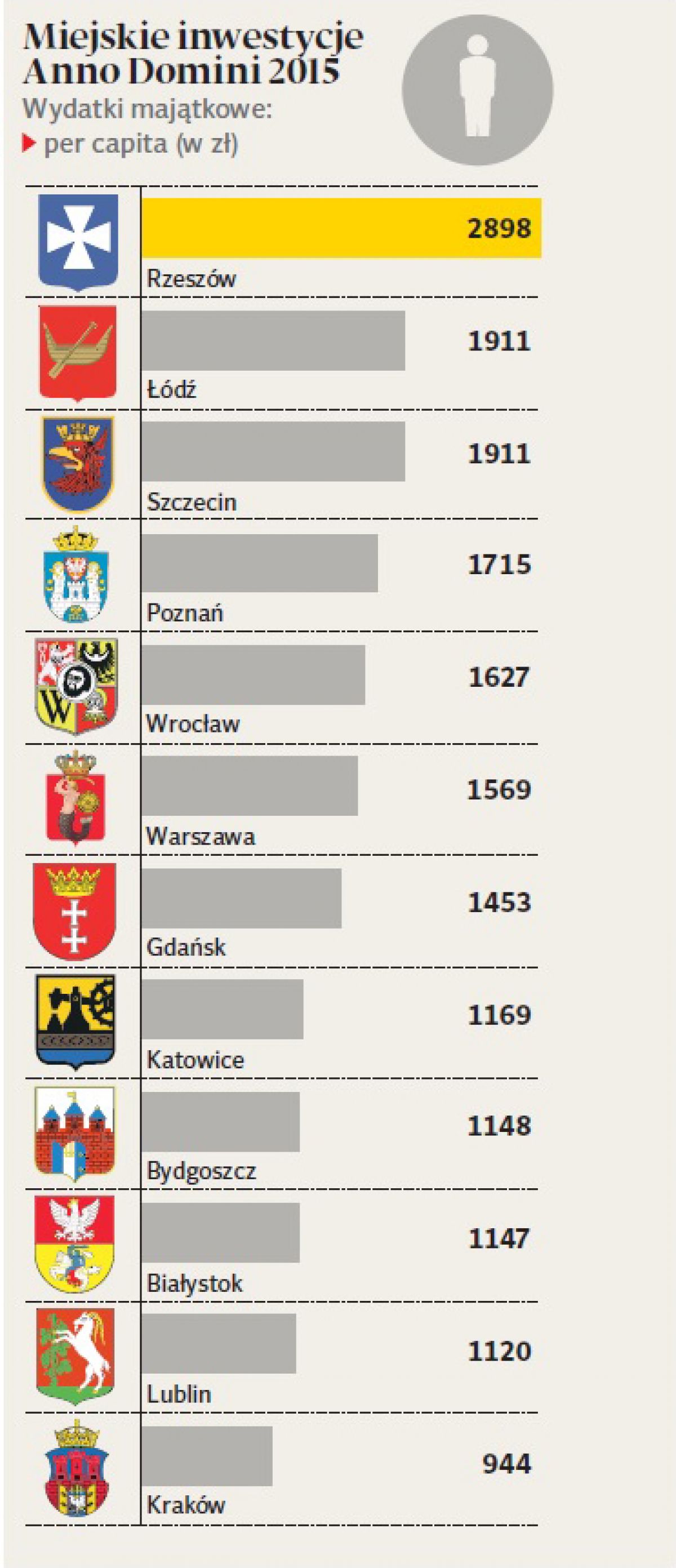 Stolica Podkarpacia przeznaczy na inwestycje 2898 złotych w przeliczeniu na 1 mieszkańca. Nieznacznie poniżej 2 tysięcy (po 1911 zł) wyłożą Łódź i Szczecin. Lider zestawienia - Rzeszów zamierza wydać 539 milionów złotych. W sumie inwestycje to aż 41 procent wydatków miasta. W porównaniu z wykonaniem budżetu inwestycyjnego za 2014 r. to wzrost aż o 88 procent. W planie są między innymi budowa drogi i mostu nad Wisłokiem, infrastruktury drogowej w strefie ekonomicznej Rzeszów-Dworzysko oraz kompleksu oświatowego z zapleczem sportowym. Zestawienie 12 największych miast tworzących Unię Metropolii Polskich wskazuje na małą stabilizację – dodają autorzy zestawienia. Nakłady majątkowe wszystkich ośrodków mieszczą się w przedziale 9-10 miliardów złotych.