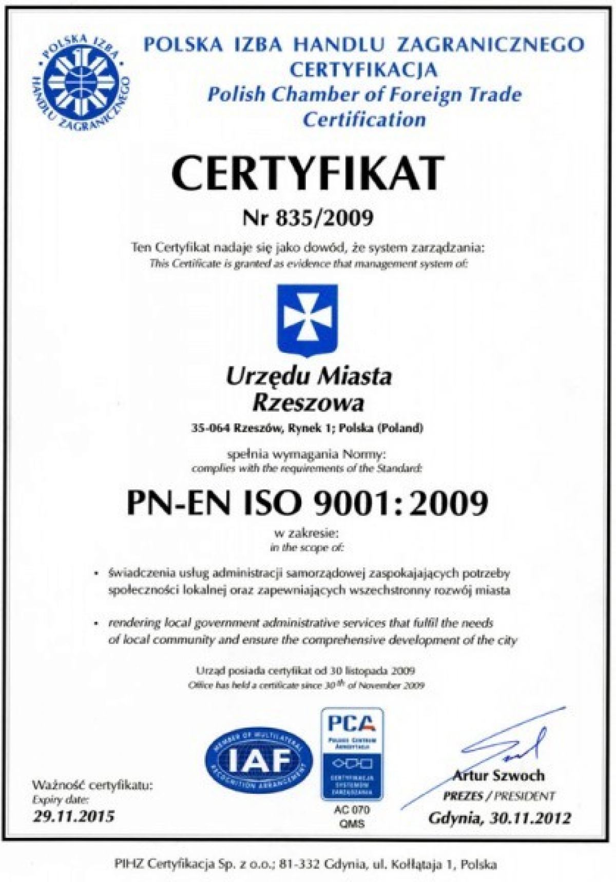 W dniach 16 – 18 listopada 2009 r. auditorzy z Polskiej Izby Handlu Zagranicznego Certyfikacja Sp. z o.o. przeprowadzili w Urzędzie Miasta Rzeszowa audit certyfikujący. Po wnikliwych analizach dokumentacji oraz dziesiątkach rozmów z urzędnikami, Urząd Miasta otrzymał oficjalne potwierdzenie tego, że pracuje zgodnie z najwyższymi standardami jakości. Zarówno polskimi jak i międzynarodowymi.