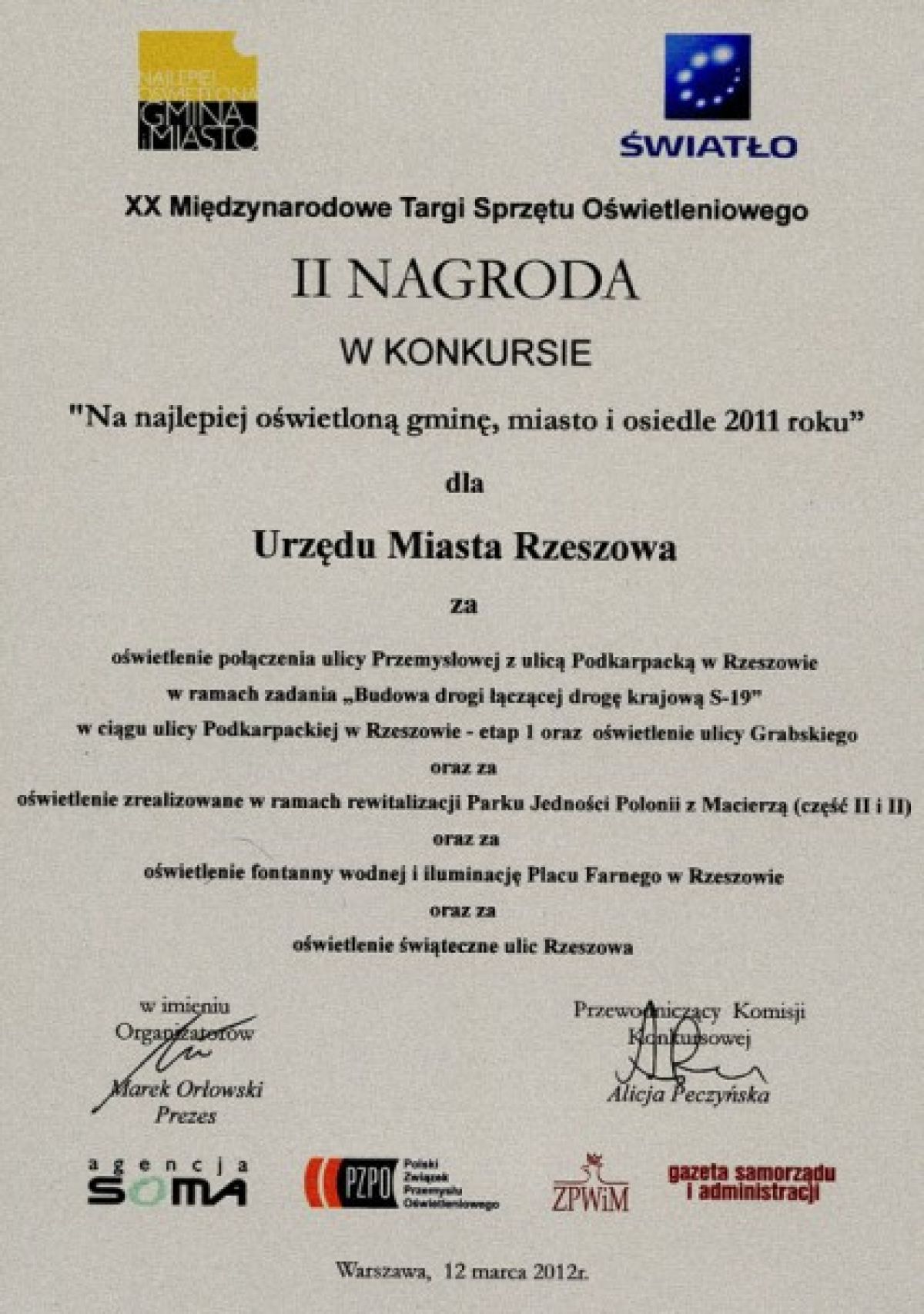 Podczas XX Międzynarodowych Targów Sprzętu Oświetleniowego Urząd Miasta Rzeszowa zdobył II nagrodę w konkursie „Na najlepiej oświetloną gminę, miasto i osiedle 2011 roku”: