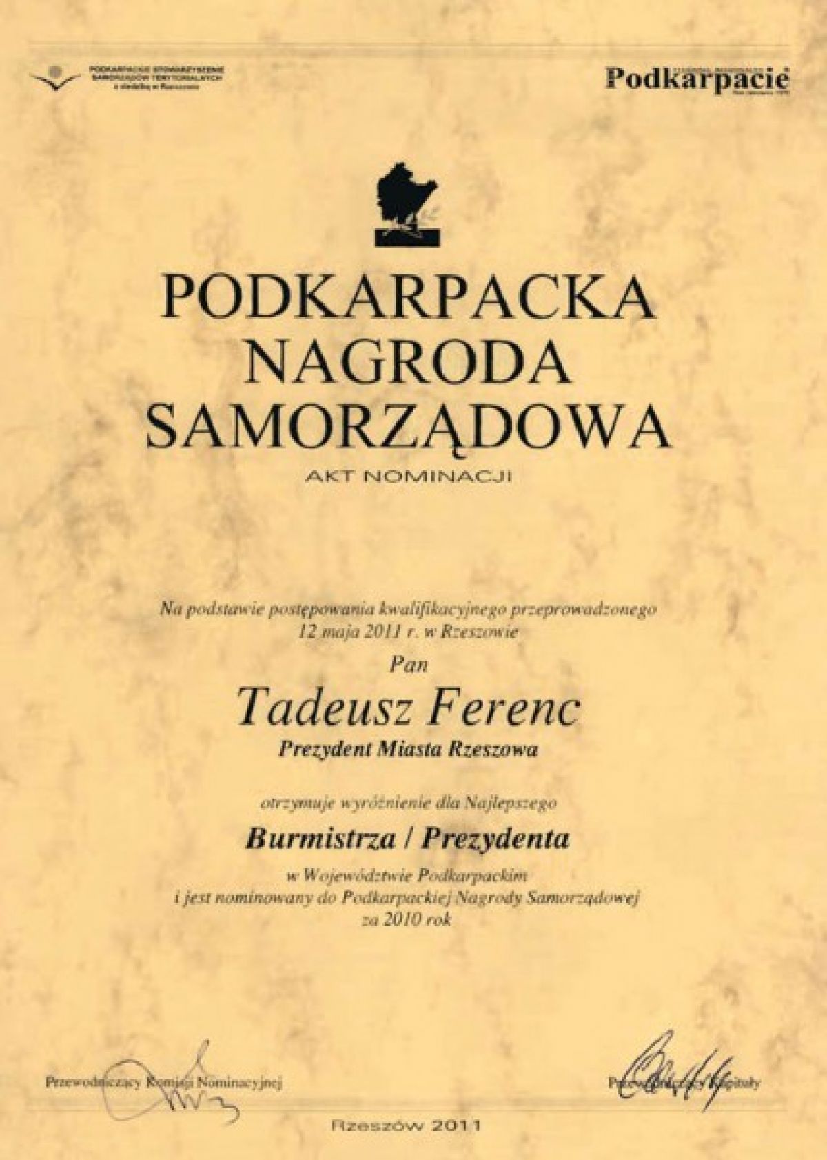 Na uroczystym spotkaniu z okazji Dnia Samorządu Terytorialnego, które odbyło się w Wojewódzkim Domu Kultury 28 maja 2011 r. Prezydent Rzeszowa Tadeusz Ferenc został nominowany do Podkarpackiej Nagrody Samorządowej za 2010 rok i otrzymał wyróżnienie dla najlepszego Prezydenta w województwie podkarpackim, natomiast Miasto Rzeszów otrzymało tytuł Lidera Samorządności w województwie podkarpackim w 2011 r.