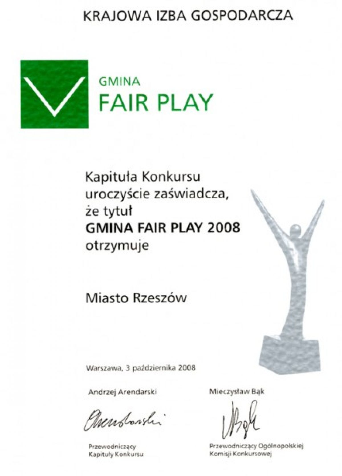 Miastu Rzeszów po raz kolejny przyznano tytuł i certyfikat Gminy Fair Play. W tym roku oprócz tytułu Gmina Fair Play 2008, Rzeszów uhonorowany został nagrodą główną konkursu - statuetką w kategorii "Duże miasto".