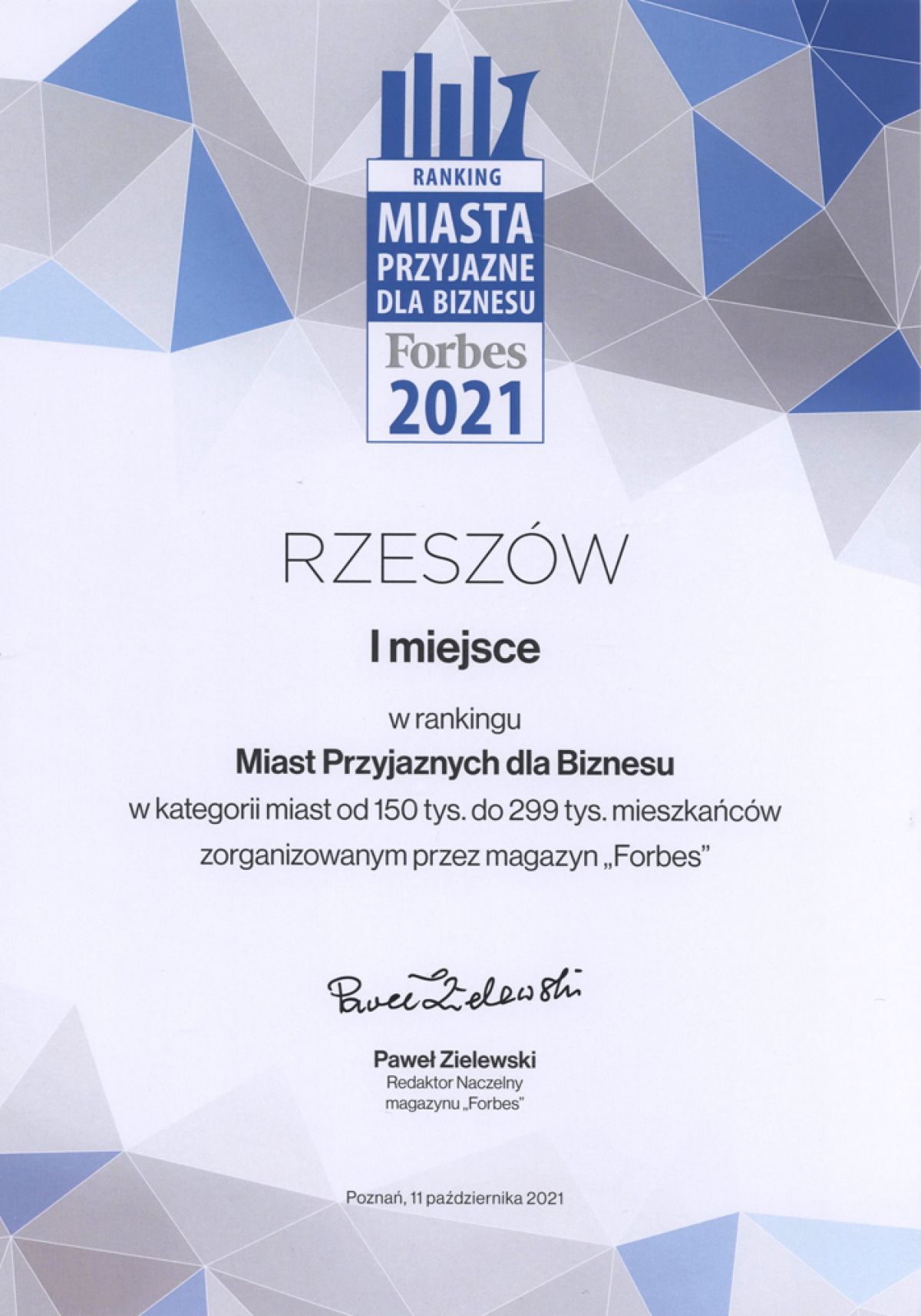 Podczas Europejskiego Forum Samorządności, które odbywało się w Poznaniu, ogłoszono wyniki rankingu organizowanego przez Forbes.pl. Pierwsze miejsce w Rankingu Miast Przyjaznych dla Biznesu, w kategorii 150 tys. - 299 tys. mieszkańców zdobył Rzeszów.