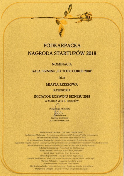 Miasto Rzeszów podczas Gali Biznesu "Ex Toto Corde 2018", która zakończyła szereg wydarzeń biznesowych "Startup Mixer" zostało wyróżnione Podkarpacką Nagrodą Startupów 2018 w kategorii Inicjator rozwoju biznesu 2018.