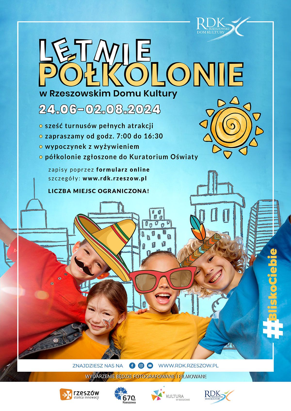 Letnie półkolonie w Rzeszowskim Domu Kultury skierowane są do dzieci w wieku 7-12 lat urodzonych w latach 2012-2017 i zostaną zorganizowane w formie sześciu turnusów. Będą one odbywały się od poniedziałku do piątku w godzinach 7:00 – 16:30 w trzynastu filiach na terenie Rzeszowa: Biała, Country (wyłącznie VI turnus), Dąbrowskiego, Krynicka, Miłocin, Pobitno, Przybyszówka, Słocina, Staromieście, Staroniwa, Wilkowyja (turnusy I-V), Zalesie oraz Załęże.