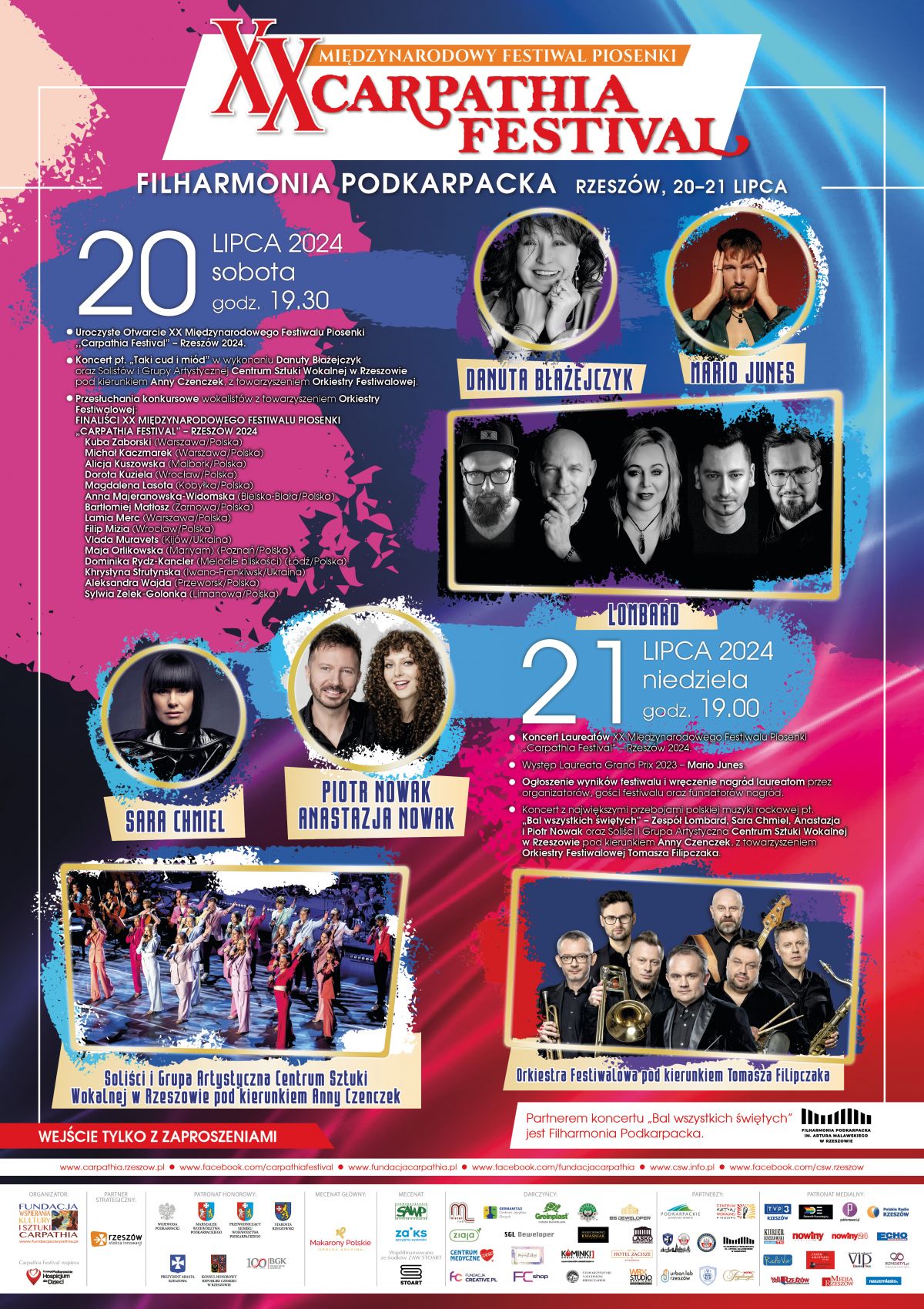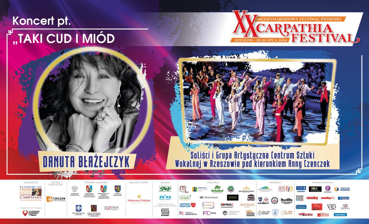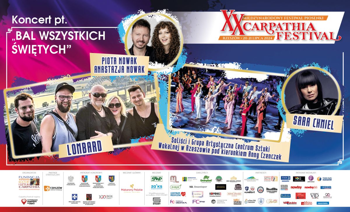 Piętnastu finalistów z różnych krajów i muzyczna walka o Grand Prix, w jury m. in. Marek Kościkiewicz, Michał Wojnarowski i Beata Molak, a w gali finałowej największe przeboje muzyki rockowej! Wystąpią: Zespół Lombard, Sara Chmiel, Anastazja i Piotr Nowak, Danuta Błażejczyk, Centrum Sztuki Wokalnej w Rzeszowie! Międzynarodowy Festiwal Piosenki „Carpathia Festival” świętuje XX edycję, już 20 i 21 lipca w Filharmonii Podkarpackiej im. Artura Malawskiego. Partnerem strategicznym jest Rzeszów-Stolica Innowacji. Partnerem Festiwalu jest Województwo Podkarpackie.