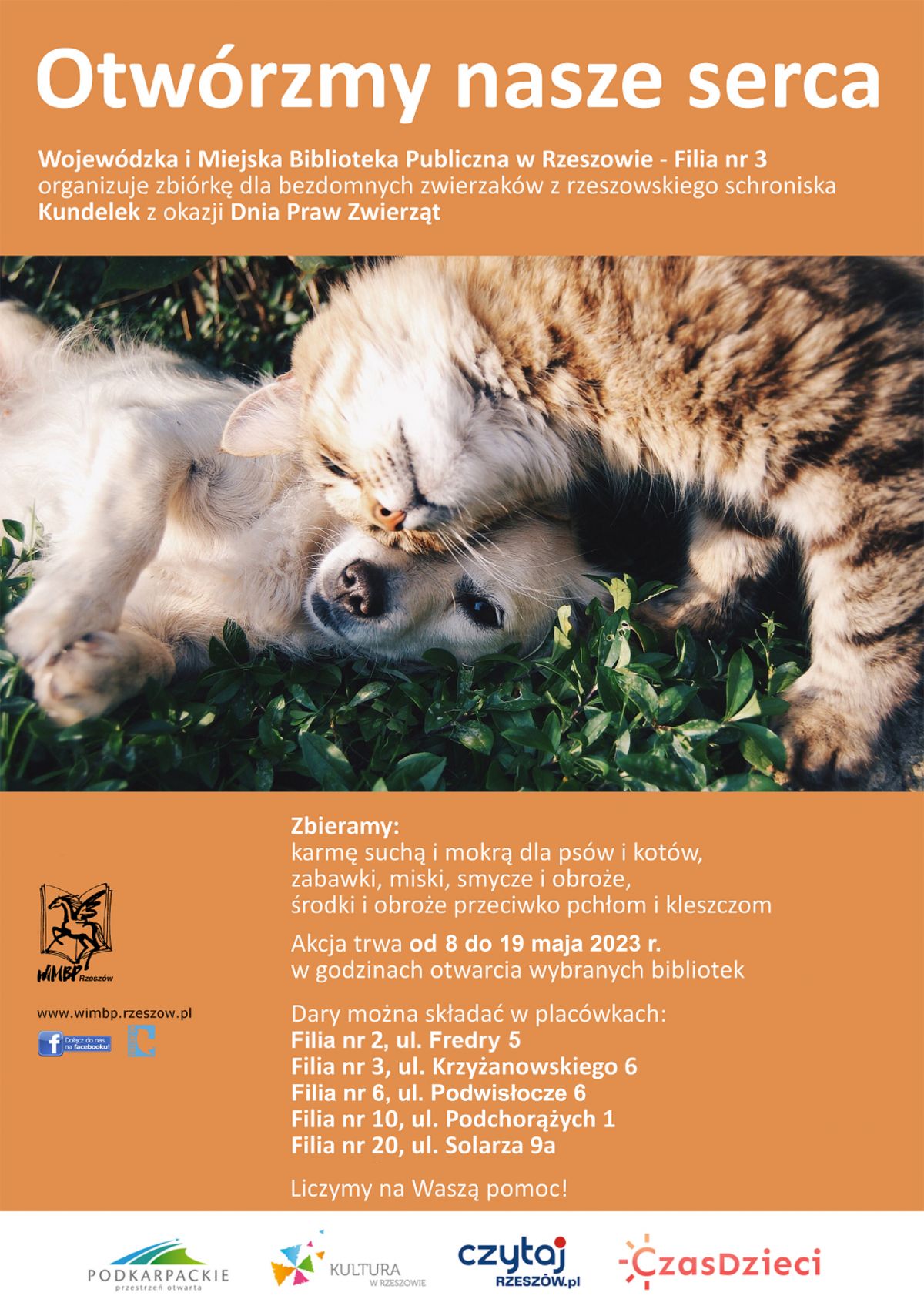Wojewódzka i Miejska Biblioteka Publiczna w Rzeszowie - Filia nr 3, ul. Krzyżanowskiego 6 organizuje zbiórkę dla bezdomnych zwierzaków z rzeszowskiego schroniska „Kundelek”