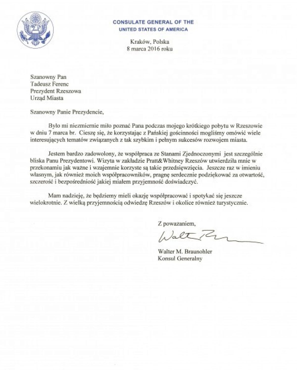 Po zakończeniu swojej wizyty na Podkarpaciu, Konsul na ręce Szefa Miasta skierował poniższe pismo, w którym dziękuje za gościnność i bezpośredniość, jakich doświadczył w Rzeszowie oraz wyraża chęć dalszej współpracy z władzami Rzeszowa.