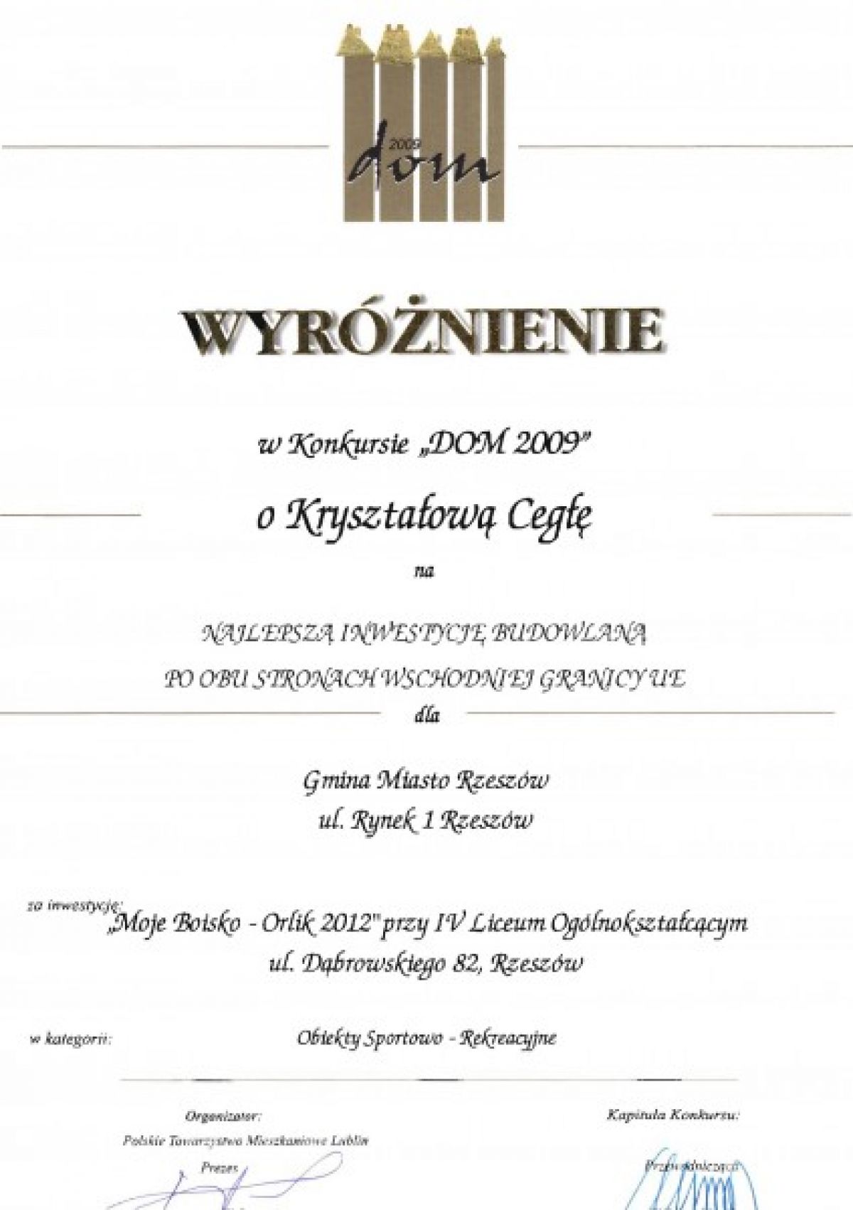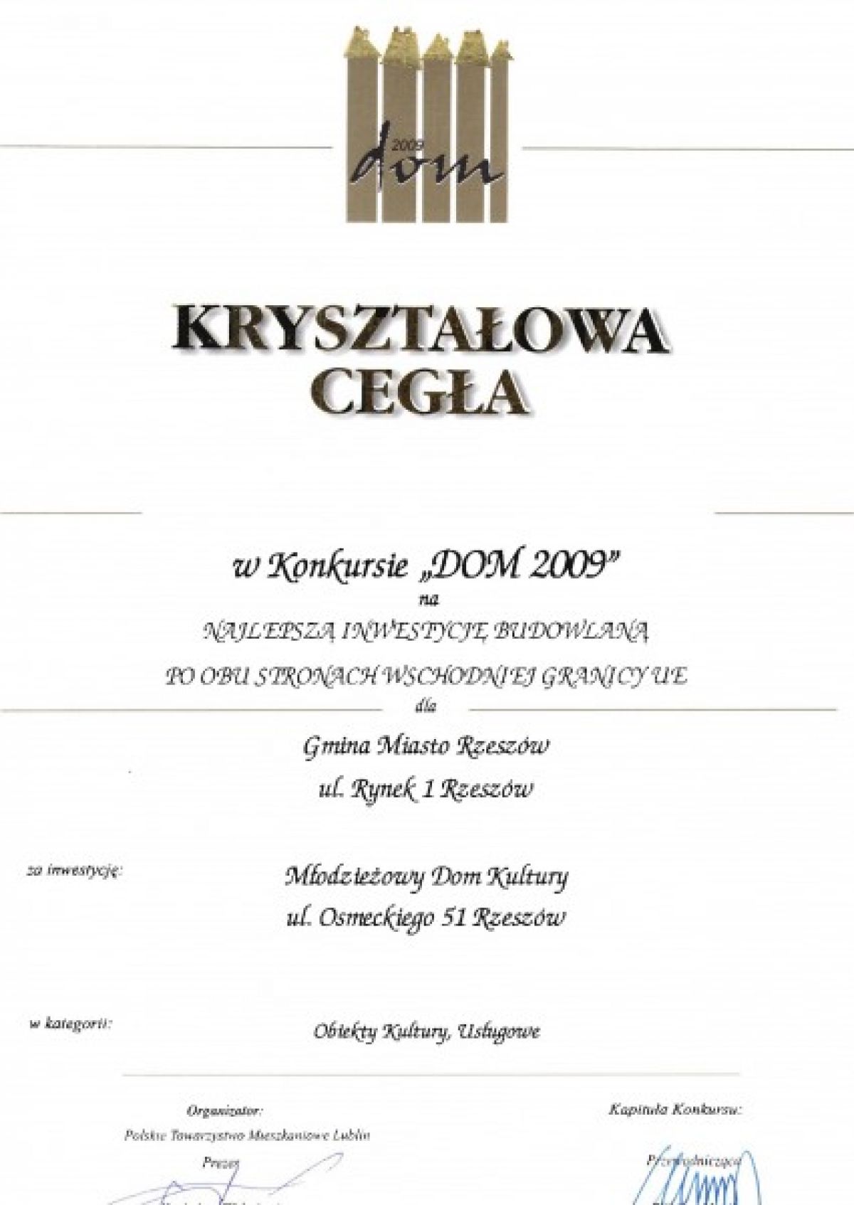W czwartek 10 grudnia 2009 roku w Lublinie, podczas gali IX edycji konkursu O kryształową cegłę, wręczono przedstawicielom Gminy Miasta Rzeszowa dwie nagrody.